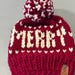 This super festive hand knit Christmas Beanie is sure to keep you in the Holiday spirit all season long! Hand crafted in super soft wool blend yarn, one side says MERRY while the other says BRIGHT. The red beanie with cream lettering comes with a luxe over-sized cream faux fur pom pom. The cream beanie with red lettering comes with a fun mixed yarn pom pom.